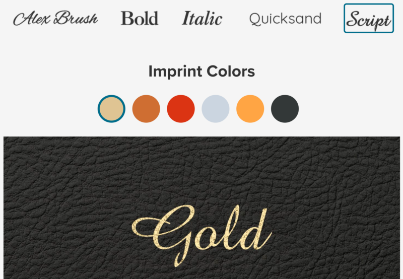 - Imprinting Colors include Gold, Rose Gold, Red, Silver, Copper, or Debossed (all but Script Font).